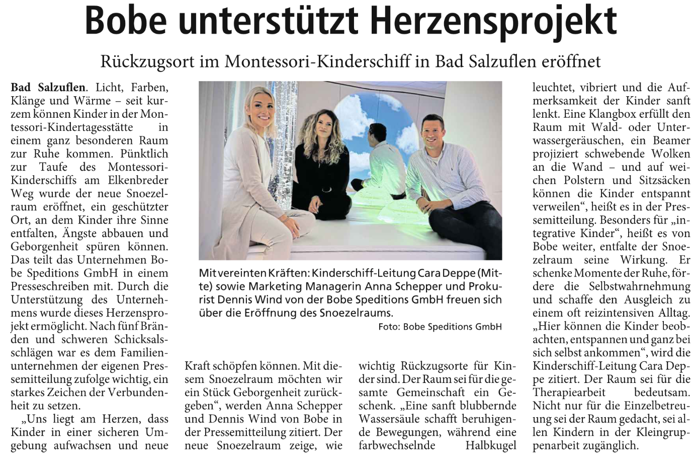 Im Montessori-Kinderschiff in Bad Salzuflen wurde mit Unterstützung der Bobe Speditions GmbH ein liebevoll gestalteter Snoezelraum eröffnet. 🌈✨